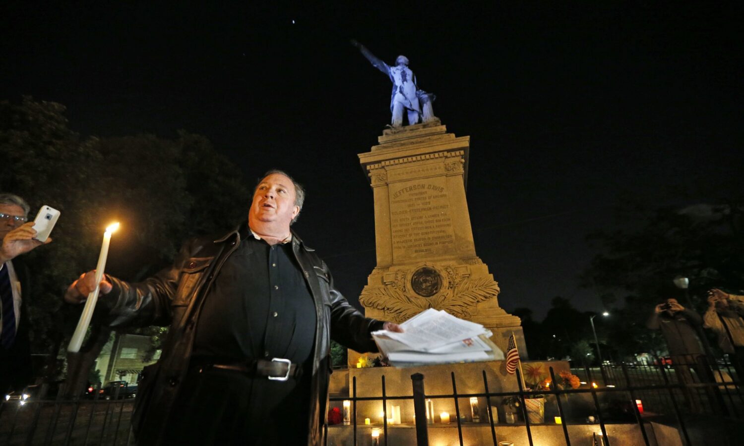 Charles Lincoln speaks during a candlelight vigil at the statue of Jefferson Davis in New Orleans, in protest at the removal of Confederate monuments. Photograph: Gerald Herbert/AP