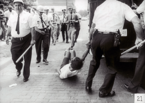 While many acts of violence towards civil rights activists happened without being captured by a camera lens, there were also many that were documented and then seen by people across the world. One iconic image that many are familiar with is the photograph of a young John Lewis being dragged and beaten by law enforcement on “Bloody Sunday” in Selma, AL on March 7th, 1965. This photo, taken almost a year prior, 15 year old Annie Lee Turner is being similarly dragged by a policeman. Despite the situation, she holds her head up and a shadow on her arm indicates her attempt to pull away. The policeman is showing no restraint. The photo also shows other policemen who are making no effort to stop or mitigate the unnecessary force. A reporter in the background runs to get a shot. Perhaps, like the photographer who captured this image, they too felt the need to document a moment where even young people were subject to violence.