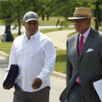 Plaintiff Derrick Edmond, left, and attorney Victor P. Henderson walk outside the Sawyer Water Purification Plant at S.79th St. and the lakefront on June 29, 2017. (Phil Velasquez / Chicago Tribune)