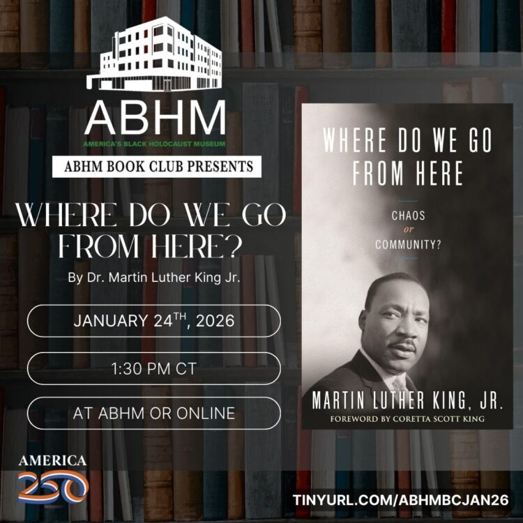 We are pleased to announce ABHM’s January Book of the Month: Where Do We Go from Here: Chaos or Community? by Dr. Martin Luther King Jr. We invite you to join us on January 24 at 1:30 p.m. for a discussion of the book at America’s Black Holocaust Museum or virtually via Zoom.